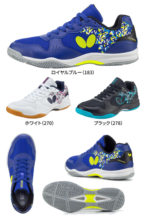 高いフィット感を保ちながら、ミッドソールに適度な厚みを加えることでクッション性も向上しました。 アウトソールには「ビーシャンク」を搭載し、プレー中の足のねじれや横ブレを抑制します。 ●カラー:ロイヤルブルー(183)、ホワイト(270)、ブラック(278) ●サイズ: ロイヤルブルー(183):19.0, 20.0, 21.0〜28.0cm(17サイズ) ホワイト(270)、ブラック(278):22.5~28.0(12サイズ) ●アッパー素材:合成繊維、人工皮革 ●ソール素材:ゴム、EVA ●特徴:ビーシャンク ●原産国:中国 ※バタフライ・シューズのソールは室内でプレーする卓球競技専用シューズとして開発されております バタフライ |